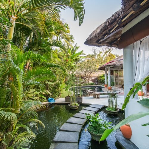 It’s famously stated as residential village where no bar nor Night club aloud. So you will be sure to sleep and stay in peaceful. While you stay in our Villa Elina, you are on the right location villa Bali. Seminyak can be reach within 5 minutes, airport just 20 minutes and Canggu with just less than 10 Minutes. This villa Bali is surrounded with Private pool and pond on entrance area, two floor Building with Wooden roof, white interior with little bit of Bohemian Touch, it bring the serenity and warmness. This Bali villa rental is perfect for those who wants to rest and take time for themselves.