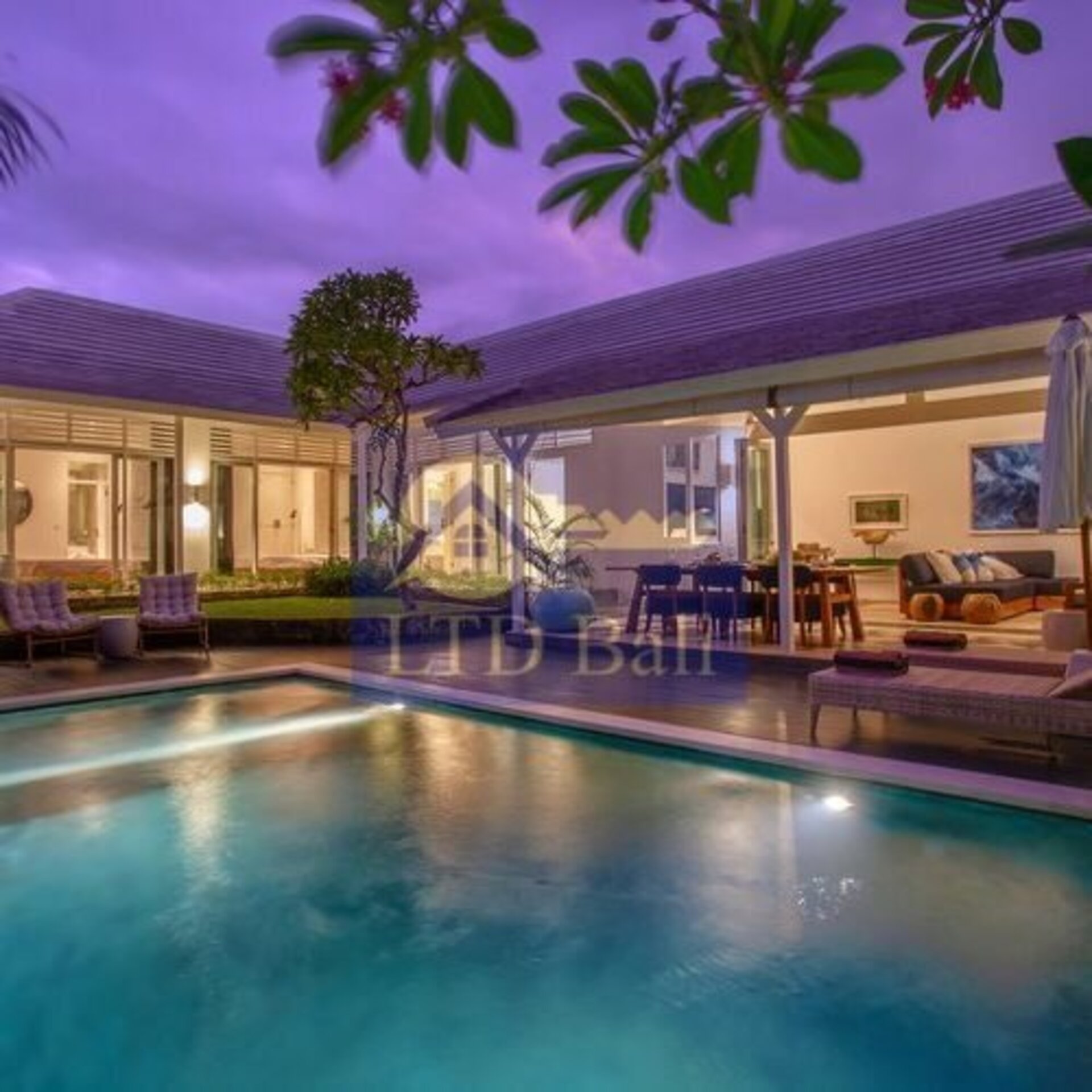 Visualised by a renowned Australian designer, classic charm meets Balinese hand crafted furnishings in this villa creating an aura of happiness while maintaining a sense of comfort. Three bedrooms are all situated under one roof, each one with swimming pool views, and equipped with large wardrobes. Each bedroom also contains its own en-suite bathroom. A special feature is the enclosed living room and open concept kitchen. Shut the rolling glass doors and turn on the air conditioning to cool off with a snack to some western television. With hosting lavish dinners in mind, the poolside dining area is located in the terrace shade.