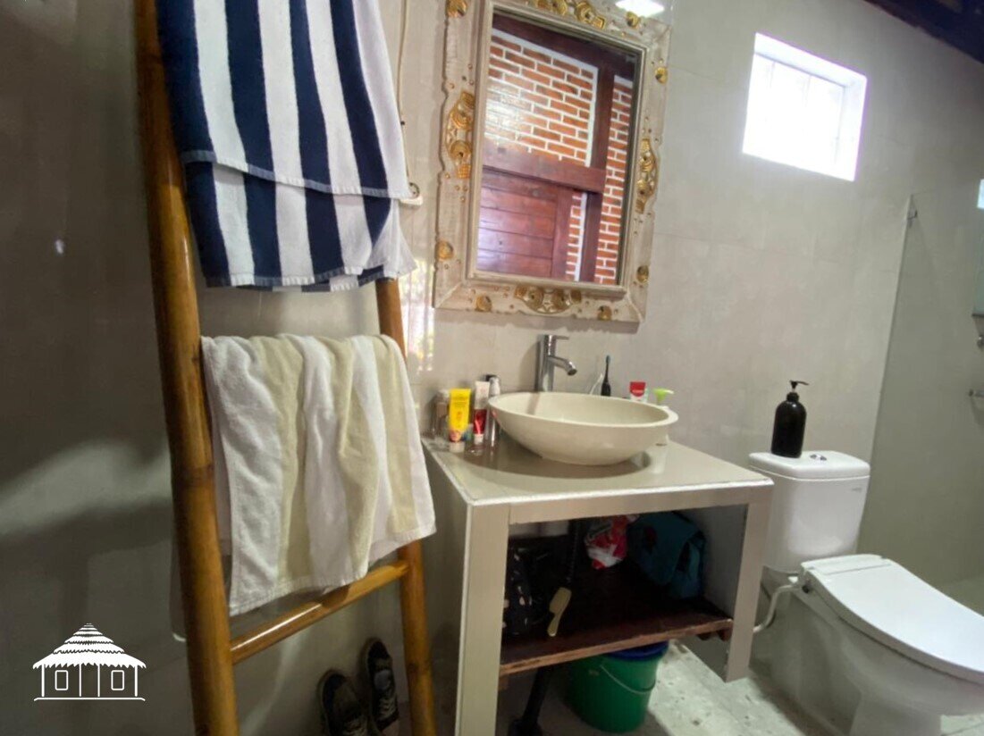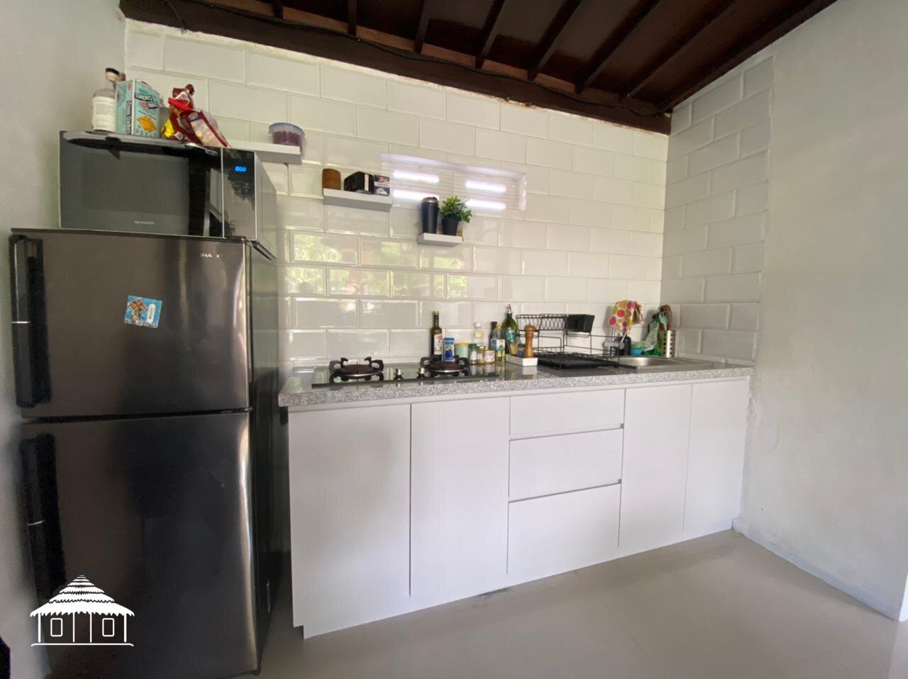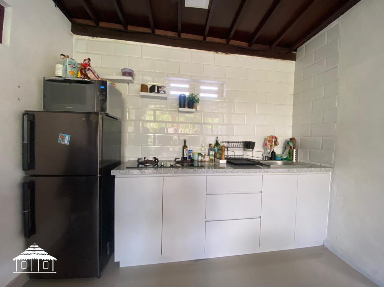 Cette villa traditionnelle en bois Joglo ,d’environ 13m x 11m comprend une grande chambre avec une armoire, une grande salle de bain attenante avec douche chaude et froide, une cuisine toute neuve et ouverte, une cuisinière, un réfrigérateur, un four à micro-ondes et un distributeur d’eau chaude et froide.