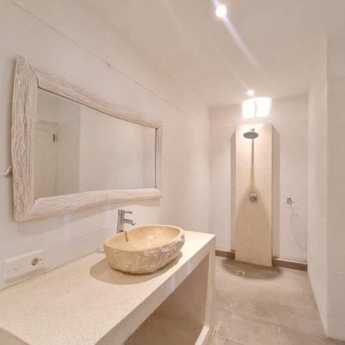 Au premier étage, un espace de vie fermé, dominé par la couleur blanche, offre un confort inégalé, ce qui ajoute à l’attrait de cette opportunité. Il y a également une cuisine équipée et une salle à manger. Chaque pièce de cette villa Bali est équipée d’un mobilier de qualité. Depuis le rez-de-chaussée jusqu’aux étages supérieurs, le confort et la commodité sont garantis.