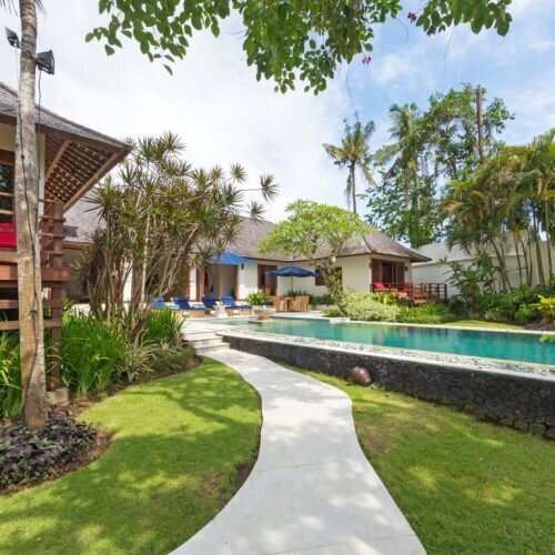 Each of 4 bedrooms are tastefully decorated in the Bali tropical style and the villa has 80m2 Kids Play room for the kiddos to enjoy and if you need to find some time for yourself, there is also a dedicated office looking out to the rice field and a TV room. A hidden gem of this villa is the Antique Joglo set in the garden with fantastic rice fields view – a popular plate for sunset cocktails.