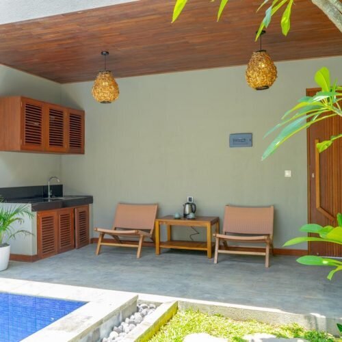 Villa Favey is one bedroom villa in Berawa. Minimalis modern and unique design villa with private pool. There is mini kitchen and living area. The bedroom with en suite bathroom and bathtub.
