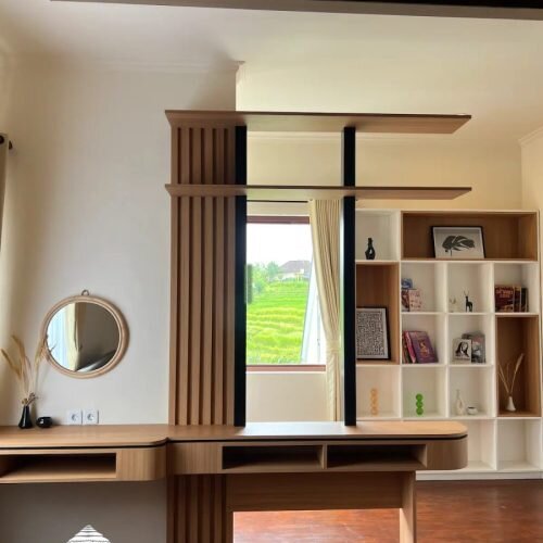 This 3 bedrooms Bali villa rental is the ultimate illustration of a refined modern house, where each bedroom is attached with a private bathroom to ensure your privacy, with a gorgeous bathtub facing the large windows. Built into a unique rectangular square, the bedrooms are positioned on the first and second floor, so the tenants can have a direct access to the ricefield view as well as the swimming pool landscape.