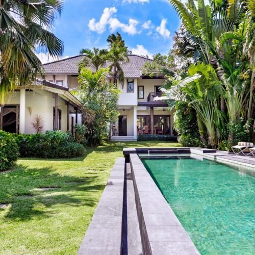 Villa Marisa is 1100 sqm private 4 bedrooms villa with a huge garden and private 15 meters swimming pool in the heart of Seminyak, in a great location and minutes to the beach, fabulous shopping and best restaurants in Bali. It is situated in 2 minutes walk from Jalan Petitnget “Eat and Shop Street”, 950 meters to famous all over the world Potato head beach club and 10 min drive to Bali’s night life at Jalan Oberoi, 25 min from Airport. The lounge opens widely on the quiet garden and 15 meters length swimming pool with sun-beds and pillows chill-out zone. With old teak floors, ceiling fan, and large rattan sofa. It’s a great area to relax with family and friends.