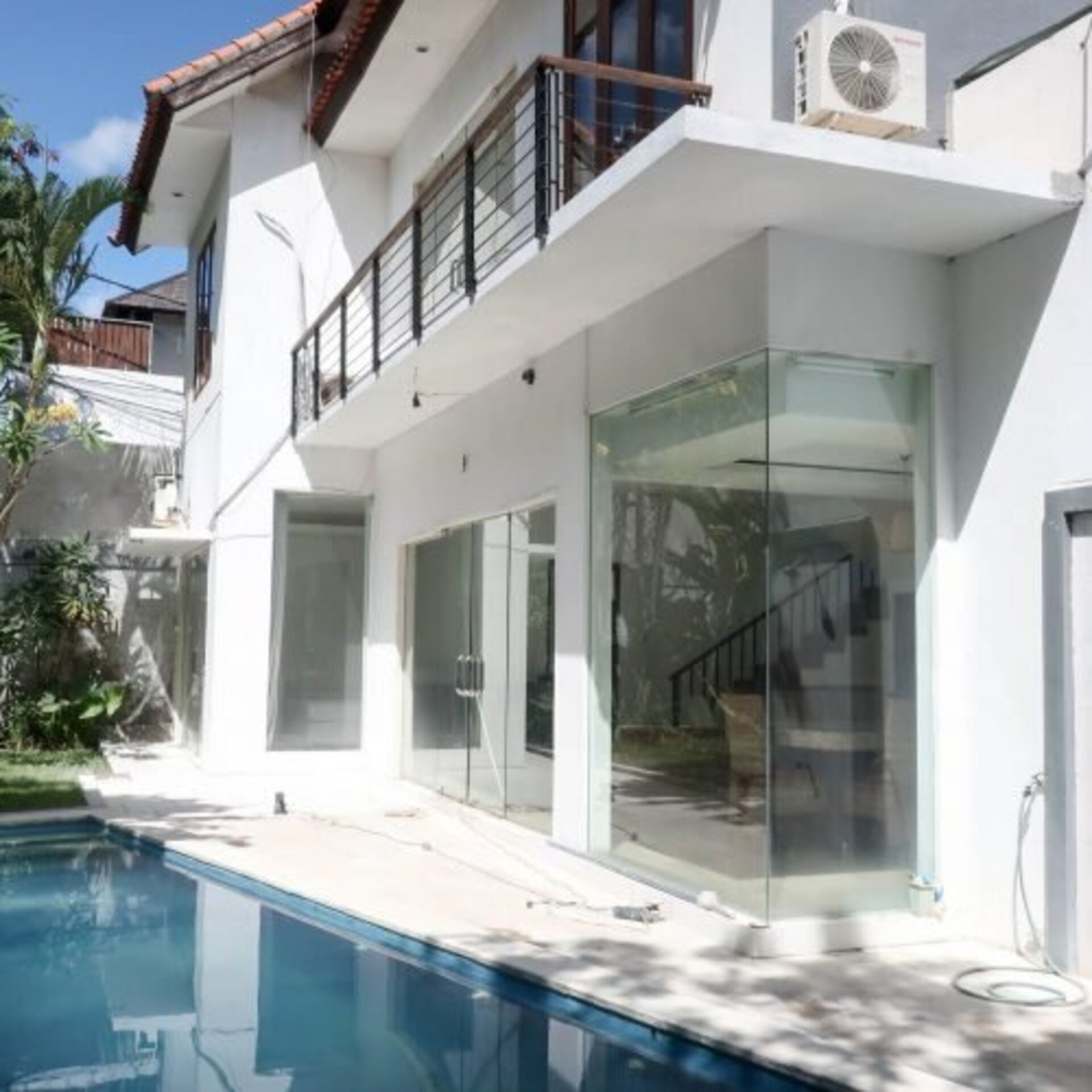 With the combination of the white building and wooden furniture, Villa Antik gives you a scent of vintage atmosphere. The two stories villa is also dominated by a wide tall glass window that allows the bright natural sunlight to fill almost all of the room. On the back of the villa, you will find a private pool and garden, this adds more fresh air to Villa Antik. On the first level of the villa, you can find a parking area that can fit a car and several bikes. When you enter the villa, you will find a living room that connects to the dining area and the kitchen, a guest toilet under the stairs, and a main bedroom near the stairs. Up to the second floor, you will find the small living area, the balconies, and the other two bedrooms.  Featured 3 bedrooms, this villa can occupy up to 4 people with 2 children since one of the bedrooms is designed for kids. Each of the bedrooms featured a bathroom with a bathtub and shower, complete with the wardrobe.
