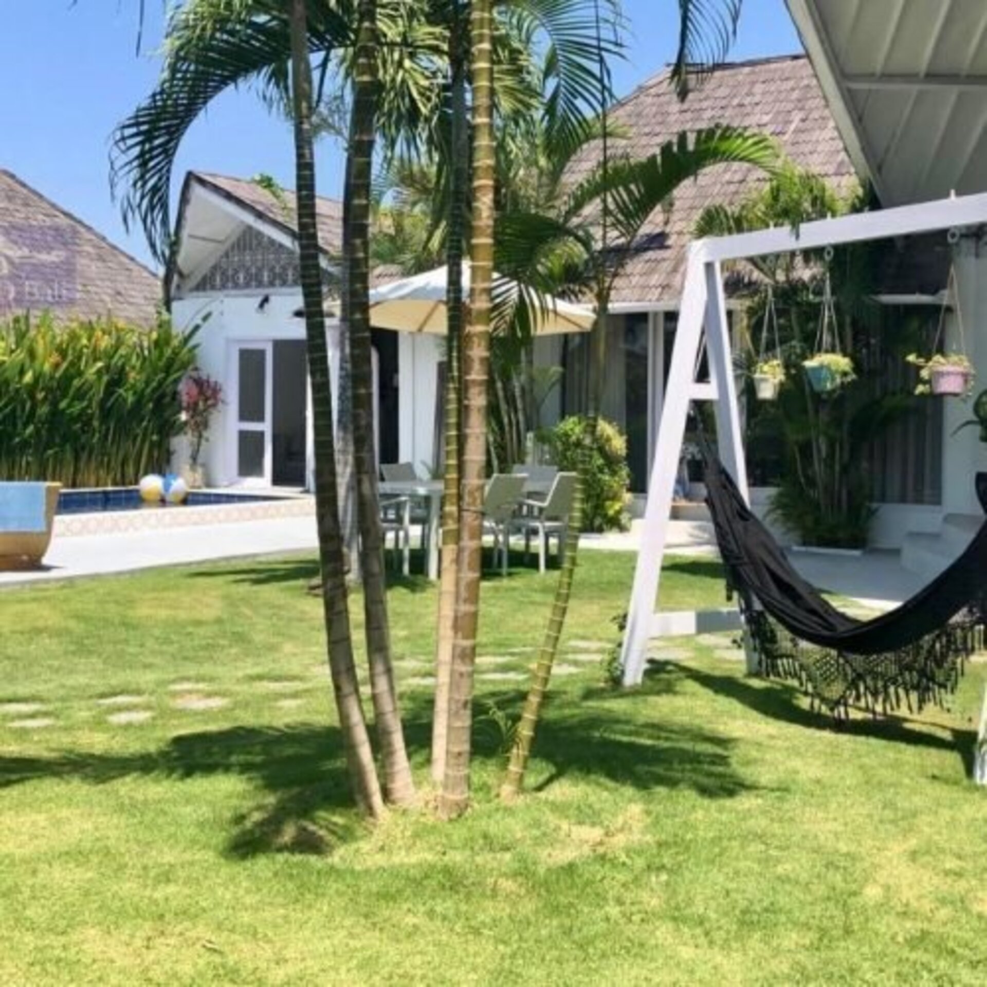 The air-conditioned villa consists of 3 bedrooms with suites bathrooms, closed living room, closed kitchen with fully kitchen equipment and flat-screen TV is available. It’s 40 minutes driving by car to the Airport.