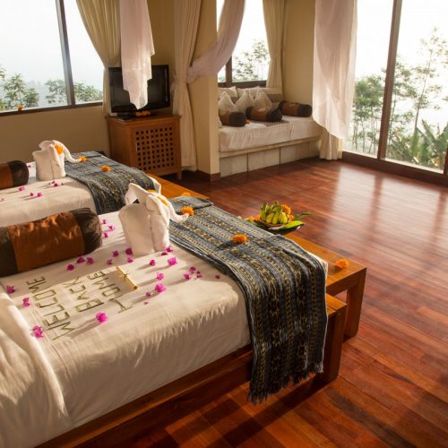 The Two Bedroom Coffee Villa is located in a private building. It’s surrounded by mature Arabica coffee trees, overlooking the rolling hills and the Bali Sea. It is set aside from the other villas and is located halfway between the main pool and the vegetable garden.