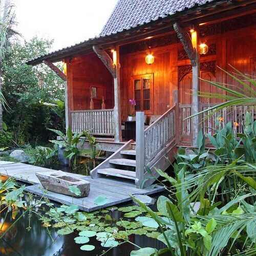 Sleeping up to two people, this villa Bali features one bedroom with a semi-open bathroom. Comfort and romance describe the room: king-size bed, television, small sitting area.  It’s the ideal place for reading or enjoying the view over the greenery, it’s a real cocoon for a couple. Then the decoration of the room and the choice of wooden furniture will give you the impression of being in the heart of the Balinese jingle, alone in the world. As for the bathroom, it’s more modern, with its double washbasin, walk-in shower or rock-cut bathtub. Like an industrial style in harmony with nature.
