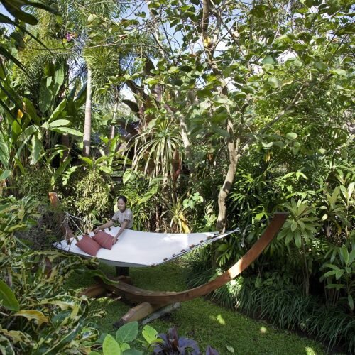 A free-form swimming pool, a poolside balé hidden out of sight and a river rock bathtub made for two. The Century-old teakwood bedroom pavilion raised on stilts above the lily pond includes a sitting and TV area, filled with whimsical furnishings from a bygone era. With adjoining kitchen, there is also second building across the lotus pond – a gladak (traditional teakwood building) – provides a dining area with small table for two or three.