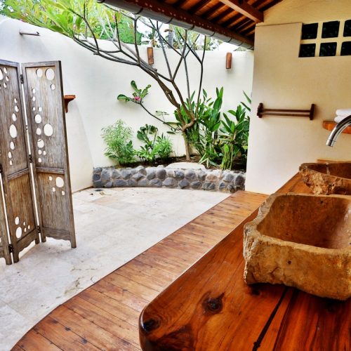 This Bali villa rental propose two bedrooms with a private pool, a green garden with a sea view. It also offers a spacious living room with a large table for 6 people. Each of the suites has a designer private bathroom with care as well as different storage, safe, desk. 7 Seas Villa is inspired by the traditional Joglo Javanais which will bring you comfort, and warmth whether you are alone, with family or friends.